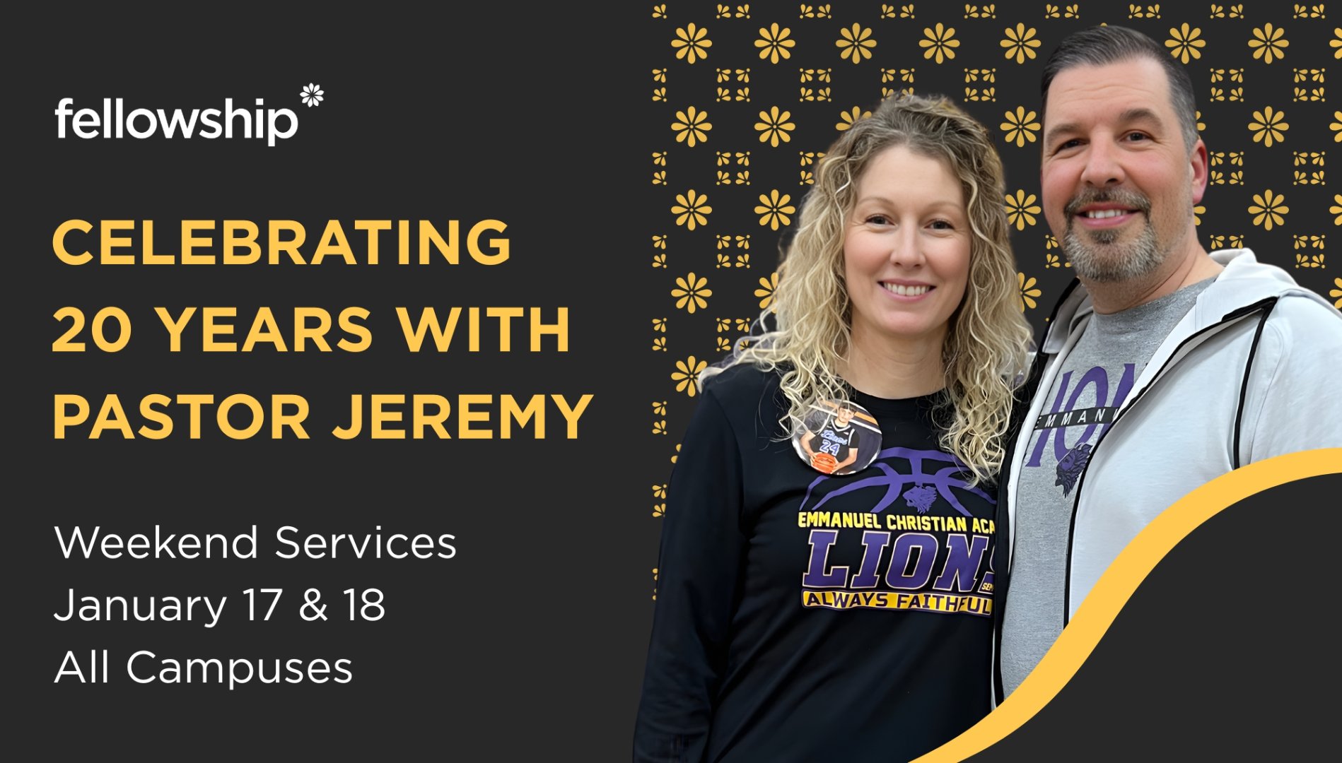 Weekend services, January 17 & 18 // all campuses // We are celebrating and recognizing Pastor Jeremy for his 20 years of dedicated service on staff at Fellowship Church. In loving God, we give glory to Him for the work he has contributed over the past two decades. We will also express our deep appreciation and encouragement for Pastor Jeremy and Julie as we commemorate this significant milestone together at a reception following each service.