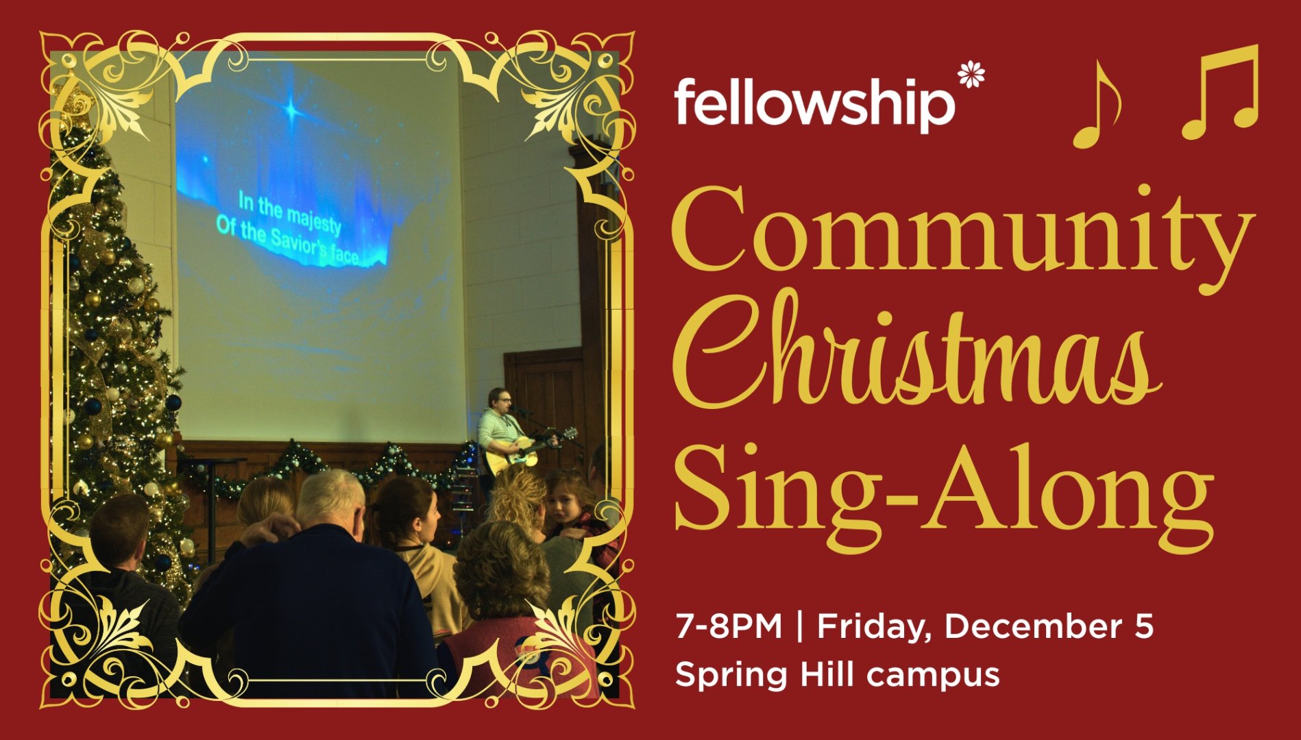 Friday, December 5 //  7-8PM // Spring Hill campus // Join us for a joyous Christmas sing-along featuring beloved carols! This special event, brought to you by Fellowship Church for the entire Springfield community, promises to warm hearts and create cherished holiday memories. Enjoy singing Christmas songs, sipping hot cocoa, and hearing a message of Christmas hope. Let us know you are coming – here!