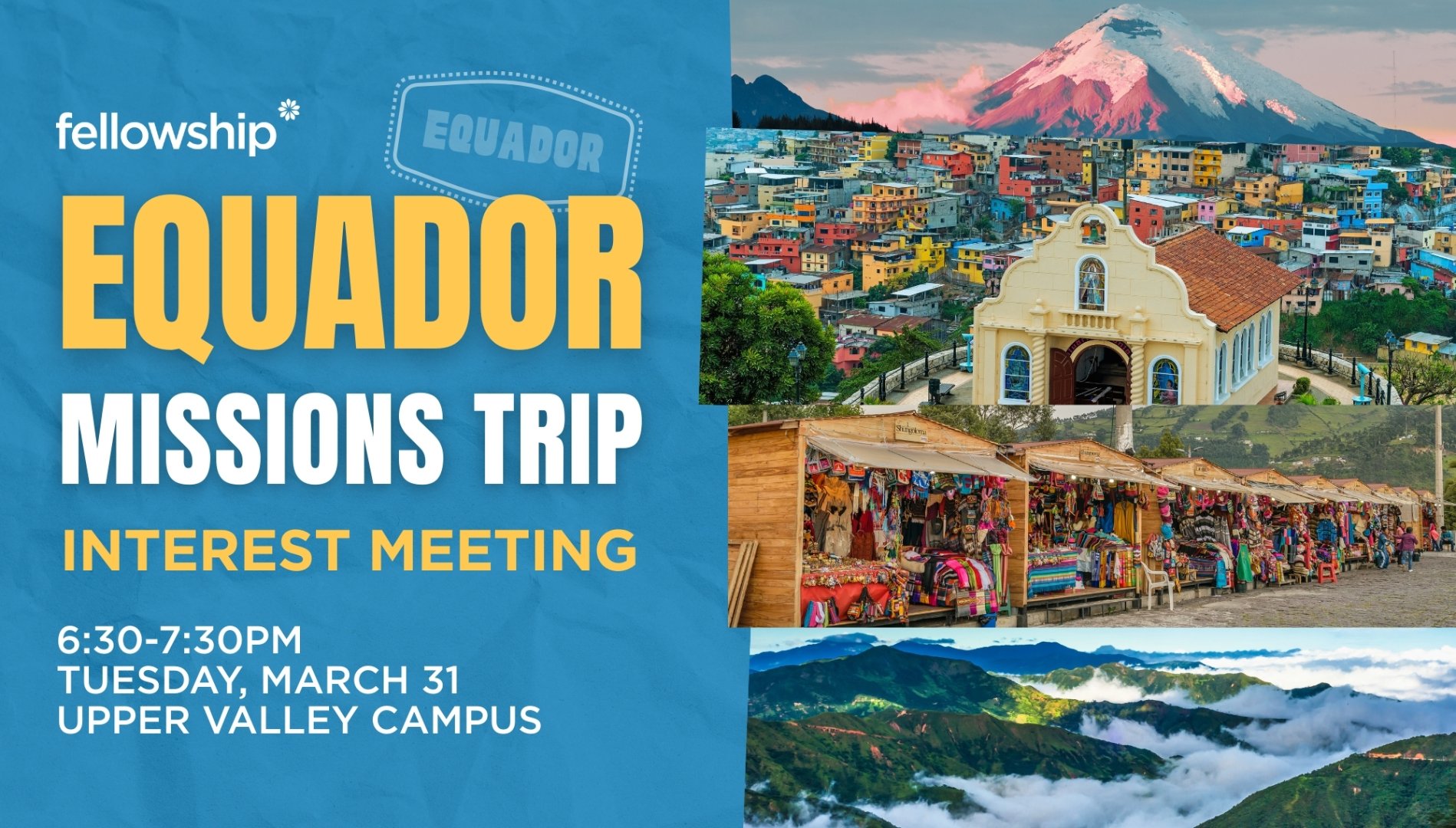 Tuesday, March 31 // 6:30-7:30PM // Upper Valley campus // Visit a land of rainforests and sun that spans the equator, a land of rich cultural heritage, a land in need of the loving message of Jesus. Join us to learn more about the people we’ll encounter and the projects we’ll accomplish in August. Sign me up to learn more!