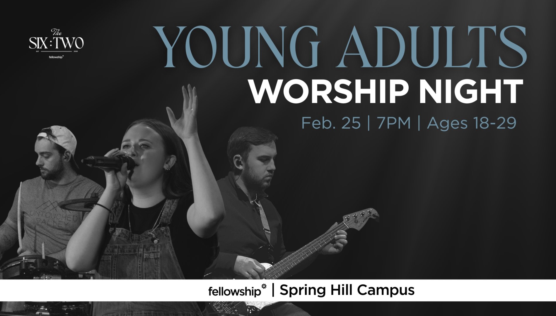 Wednesday, February 25 // 7PM // Spring Hill campus // Young Adults-ages 18-29! Help launch Fellowship’s new Young Adults ministry – The 6:2. Join us for a night of worship as we welcome God’s leading and grace, growing closer to God and others. I’ll be there!
